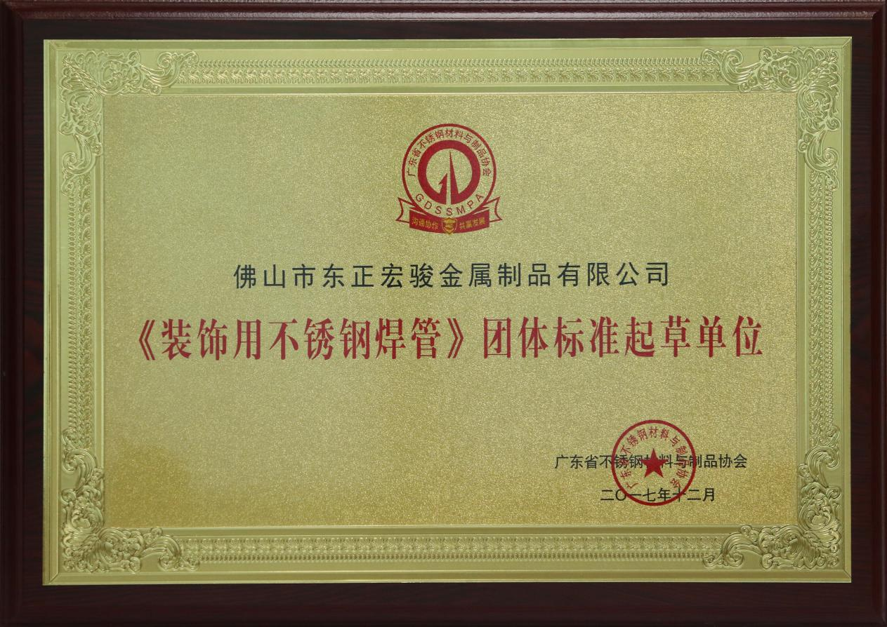鑒于泓冠不銹鋼一直以來的品質堅持,在行業中已經樹立起品牌名氣,行業協會多年來聘任東正宏駿為《裝飾用不銹鋼焊管》團體標準起草單位職位。這是對泓冠不銹鋼的品質形象的認可,對泓冠不銹鋼來說也是一種特殊的榮譽。